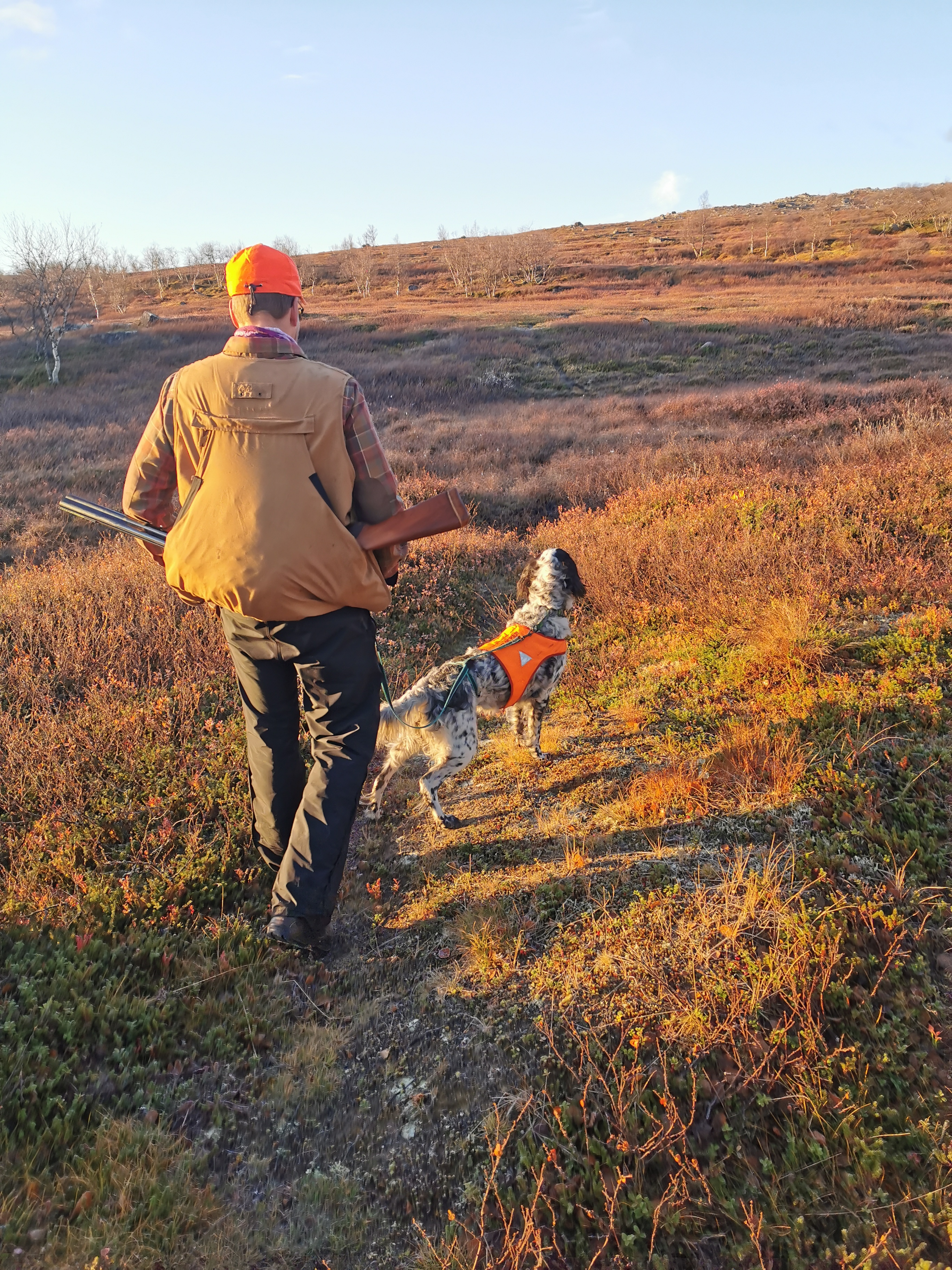 På bildet ser vi deltager og prøveleder Janne Koskela med sin engelsksetter i flott jaktterreng. Her bærer han hagla i en smart jaktvest.