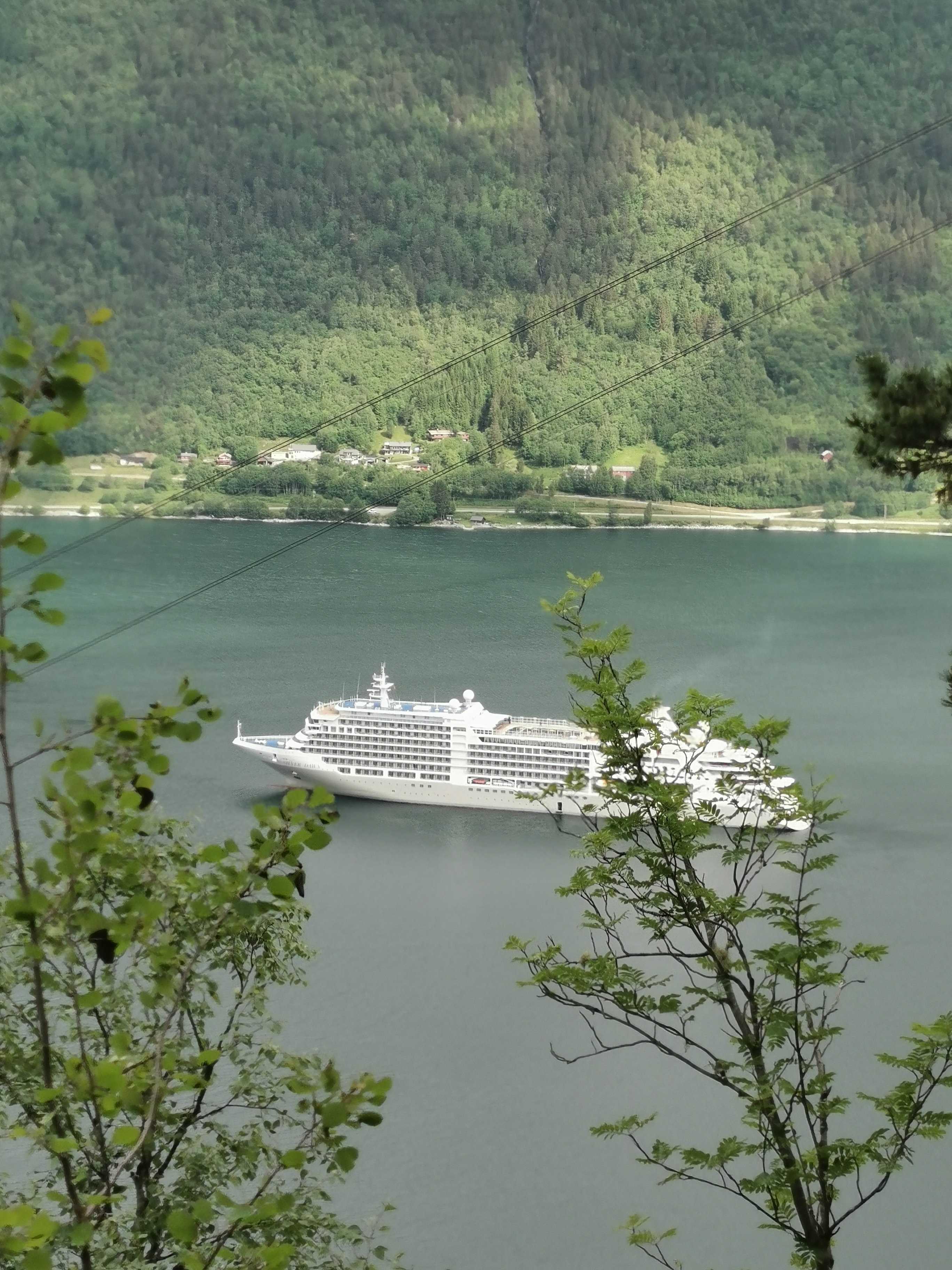 Bildet viser Romsdalsfjorden og innseilingen til Åndalsnes. Bildet ble tatt under nedstigningen fra Rampestreken idet jeg møtte hyggelige amerikanere, som var passasjerer på avbildet cruiseskip.