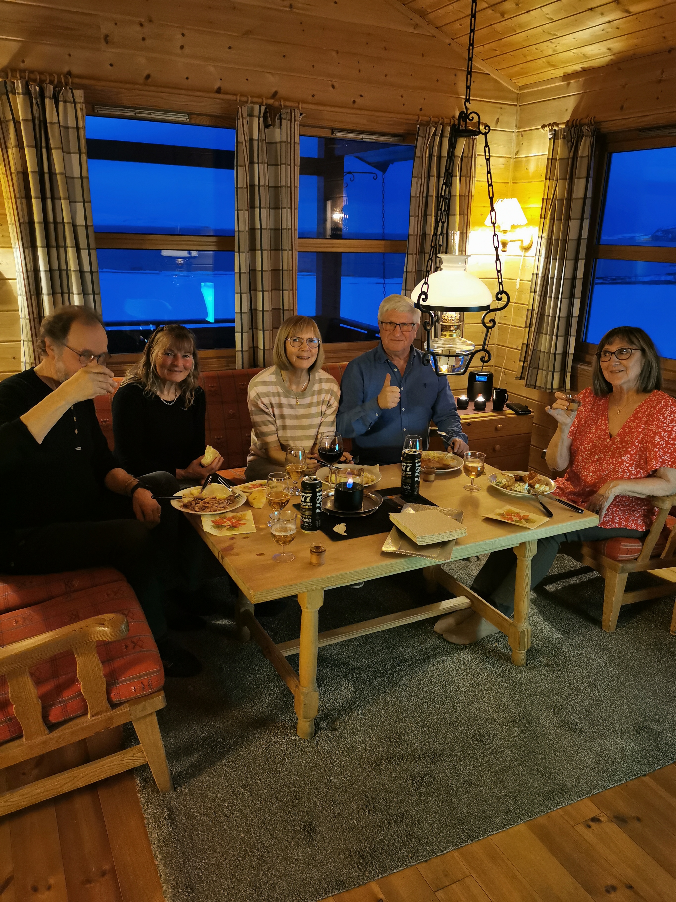 Her er Kjæsalliansen samlet på hytta mi i Sløkevika for å feire min årmålsdag. Fra venstre til høgre er hyttenaboene Asbjørn og Solfrid, deretter Ingeborg og Trond, som har hytte på Kjæsvann og Unn, som til daglig bor i Alta.